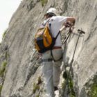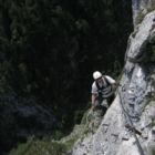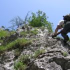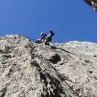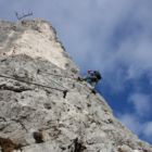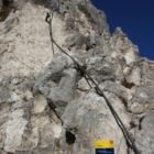 Plötzlich steht man vor der riesigen Pfeilerwand und blickt ehrfürchtig nach oben. Jetzt geht’s ordentlich zur Sache (C/D). Tipp: Hoch antreten, mit einem Bein über das Seil steigen und sich mit hoffentlich guten Handschuhen am Seil ein paar Meter hochhangeln, bis man wieder sicheren Stand hat.