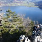 Nach diesem Adrenalinkick wird leichtes Gelände am Mondsee Klettersteig erreicht. Es geht über den Zackengrat, wo auch ein paar gute Rastplätze vorhanden sind. Einige Plätze sind sogar im Schatten – den kleinen Bäumchen sei Dank. Über schroffe Felsspitzen, die es zu umturnen gilt (B), geht es weiter zum Tiefblick und weiter zur letzten Herausforderung des Drachenwand Klettersteig – die Gipfelwand.