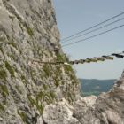 Die mit Sponsorenwerbung zugepflasterte Seilbrücke am Drachenwand Klettersteig ist der Wahnsinn schlechthin! Du wirst insgesamt 3 Seile entdecken. An der linken Seite befindet sich ein Seil auf der rechten Seite zwei übereinander. Das obere ist zum Sichern, das untere zum Festhalten. Hänge deinen rechten Klettersteigkarabiner in das obere Seil ein.