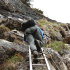 Am Einstieg des Drachenwand Klettersteig geht es zunächst ziemlich easy (A/B) zur ersten Leiter (B) und an dieser hinauf. Direkt auf die erste Leiter folgt die zweite (B). Etwas ungewohnt sind hier die sehr weiten Trittabstände auf der zweiten Aluleiter. Der Ausstieg ist etwas tricky, da erst noch auf einen Eisenbügel gestiegen werden muss.