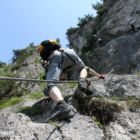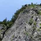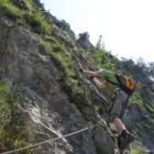 Bald kommt der kleine Überhang in Sicht. Tipp: Problematisch ist eigentlich nur der letzte Trittbügel des Überhangs. Hier hilft es, mit den Händen weit vor ins Seil zu greifen und dann mit Schwung den linken Fuß auf den Felsen rechts neben den Trittbügel zu setzen. Dabei dann leicht in die Hocke gehen und den rechten Fuß auf den Bügel setzen.