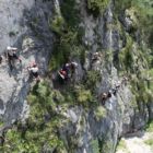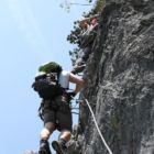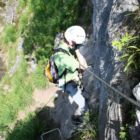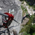 Das Werner Wandl (B/C) ist anfangs ganz leicht überhängend, doch nicht sonderlich schwer. Man muss sich nur an die nun sehr wild verdrehte Abfolge der Trittbügel gewöhnen. 🙂 Vom Werner Wandl im Isidor Klettersteig hat man auch einen sehr guten Einblick in die rechts verlaufende „Hotelroute“, die manchmal aber auch überlaufen sein kann.