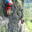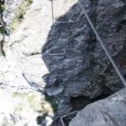 Dann führt das Seil ziemlich abenteuerlich und luftig um den Berg herum. Aufgrund der Ausgesetztheit ist diese Stelle ebenfalls mit C bewertet, obwohl die Passage dank der vorhandenen Trittbügel keine besonderen technischen Schwierigkeiten darstellt.