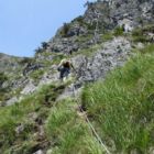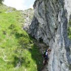 Tipp: Wer am Quergang etwas „Respekt vor der Höhe“ hat, hängt sich mit seiner Bandschlinge mit Rastkarabiner, die er oder sie hoffentlich dabei hat, zusätzlich ein. Nach der Ecke geht es ziemlich steil bergab (Achtung erdig!) in die Anderl Nische, wo man dann wieder direkt an der Felswand ziemlich steil und schweißtreibend weiter zum Sattel aufsteigt (A/B).
