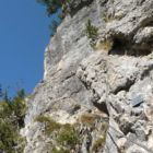 Doch der Reihe nach. Von der Plakette unterhalb des waagrechten Seils geht es zunächst einen Trittbügel senkrecht rauf, dann moderat ansteigend über einen Felsen. Dann wird es plötzlich senkrecht, und man steigt leicht nach rechts querend zuerst ein paar Trittstufen dann auf Reibung nach oben.