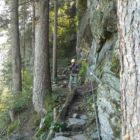 Ein paar Mal geht es noch ziemlich ausgesetzt um Felsnasen herum, danach klettert man dicht unter einem mächtigen Felsdach. Am schwierigsten ist eigentlich die steile Reibungspassage bis zum Baum. Danach folgt Gehgelände bis zur Seilbrücke des Huterlaner Klettersteig.