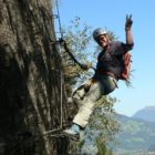 Die Seilbrücke führt ca 10 m über Gebüsch, danach folgt ein kurzer Aufschwung am Felsen. Tipp: Am Aufschwung super Fotografierposition, wo man den kletternden Partner auf der Seilbrücke vom Huterlaner Klettersteig vor der schönen Kulisse des Zillertals ablichten kann!