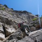 Am Ende der Steileinlage wirds nochmal brutal ausgesetzt. Hier die Bandschlinge nutzen und sich am Felsen herummanövrieren. Tipp: Wenn dein Kletterpartner hier ein Stück vorgeht, kann er von dir ein geiles Foto mit Seepanorama schießen. Danach querst du erneut ein schmales Grasband.