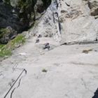 Ich kanns gar nicht oft genug sagen – auch hier helfen wieder gute Klettersteigschuhe, wo du ordentlich Druck auf den Fels aufbauen kannst. Die letzte Etappe beginnt mit einer feuchten Rampe, dann zieht das Seil nach links in einen leichten Quergang, bevor es wieder nach rechts einschwenkt.