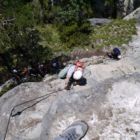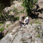 Tipp: Am Fels klettern ist hier nicht, denn der ist feucht und rutschig. Hier hilft es wirklich nur sich am Seil nach oben zu ziehen, während man die Füße in kleinen Schritten möglichst mit der Climbing Zone (Fußspitze) nachsetzt. Du musst hier mächtig Druck auf den nassen Fels aufbauen, sonst rutscht du weg.
