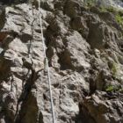 Das Seil läuft rechts von dir in einer kleinen Felswand. Die Rampe ist zu dieser Felswand auch noch leicht abschüssig. Übers Seil steigen geht hier leider nicht, da die Felswand im Weg ist. Achtung, an einer Stelle führt das Seil wirklich extrem nah am Fels vorbei. Pass auf, dass du dir hier nicht den Handrücken am Felsen aufschürfst! Der C Schwierigkeitsgrad schwächt sich bald zu B ab.