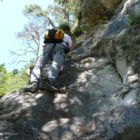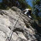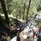 Hier haben sich die Erbauer des Klettersteigs offensichtlich gedacht, wenn schon ein Felsen mitten im Wald herumsteht, dann nehmen wir den auch noch mit. 😉 Die besondere Schwierigkeit besteht darin, dass dieser Felsen meist feucht ist und dadurch der Grip am Felsen sehr stark nachlässt.