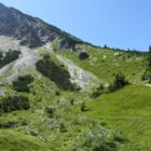 Durch den Steig wird der Abstieg nicht empfohlen, sagt ein Schild. Ich würde jedoch sagen, dass man den Abstieg generell verbieten sollte, da man aufsteigende Kletterer ständig behindert. Der bessere und bequemere Abstieg erfolgt gefahrlos auf dem grünen Bergrücken des Iseler.