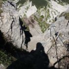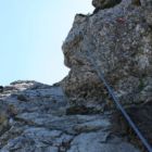 Die Schlüsselstelle ist mit C bewertet und eigentlich laut Klettersteig Schwierigkeitsgrad nicht sonderlich schwierig. Die Höhe und Ausgesetztheit kann hier doch einem schwer zu schaffen machen. Einen kurzen Augenblick hängt man beim Umklinken an einem Arm – ein paar hundert Meter über dem Abgrund nur auf einem winzigen Trittstift stehend…