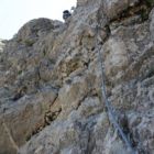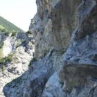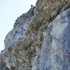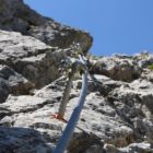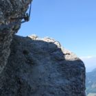 Teilweise muss man auch etwas hinabsteigen. Ist aber kein Problem, das Klettersteigset sollte lang genug sein. Hat man diese etwa 15 m Quergang geschafft, kommen zwei Eisenbügel ins Blickfeld. Wem hier schon schwindlig ist, sollte sich erstmal hier mit der Bandschlinge sichern und kurz durchatmen. Denn die nun folgende Stelle wird spannend und zerrt einiges an den Nerven.