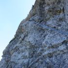 Doch nun zur Schlüsselstelle selber. Eigentlich ist es mehr eine Schlüsselpassage, die ich nun beschreiben möchte. Es fängt mit einem extrem ausgesetzten ansteigenden Quergang an. Die Tritthilfen stellen hier handtellergroße Trittplatten dar, auf denen man sich Schritt für Schritt hinüber tastet. Tipp: Genau hinschauen, die silbernen Trittplatten heben sich nur schwer farblich vom grauen Fels ab.